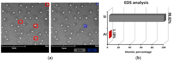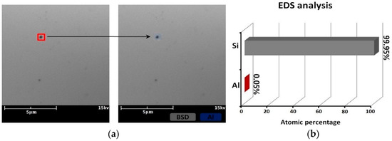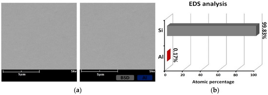 The surface morphology and EDS results in the scanning electron micrographs of sample #1 after IBE processing are shown in Figure 3. Follow IBE, a 100-nm depth is removed by EJP. The SEM results after EJP are shown in Figure 4. The results of etched 60 nm depth in sample #2 in SAE processing are shown in Figure 5. The atomic percentage of Al is marked in part (b) for Figure 3, Figure 4 and Figure 5.