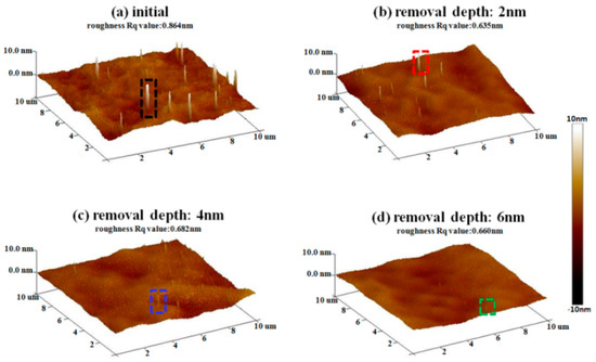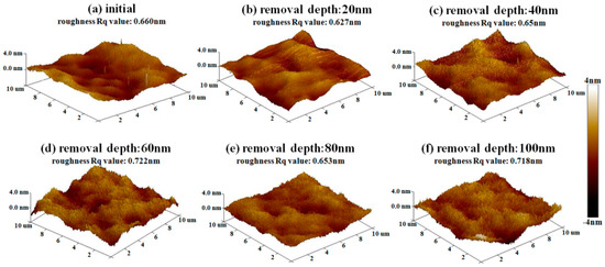 Then, the results of etching at 20 nm, 40 nm, 60 nm, 80 nm, and 100 nm depths, followed by EJP surface morphology research in Sample #1, are shown in Figure 8. It can be seen that roughness Rq value fluctuates and its evolution cannot be distinguished obviously in EJP postprocessing. When removal depth comes to 100 nm, roughness rises to 0.718 nm, which indicates that surface quality of sample #1 becomes worse after EJP postprocessing.