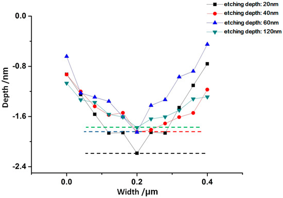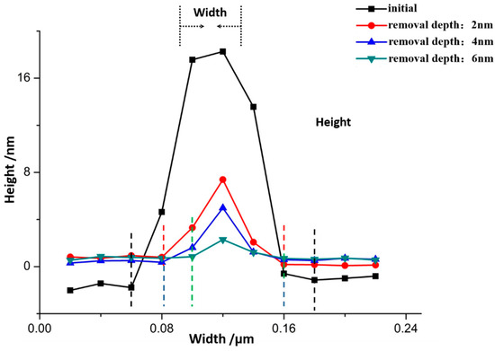 In Figure 7, the size evolution of bulges marked in Figure 6 is analyzed. With the increase of removal depth, the height of bulges decreases from 0.018 μm to 0.002 μm, while width decreases from 0.276 μm to 0.123 μm, the aspect ratio increases from 15.3 to 61.5. For roughness, the initial value of surface is 0.864 nm (Figure 6a). When the removal depth is 6 nm, the surface becomes smooth and its roughness value drops to 0.660 nm. Compared with Figure 6, the existence of bulges affects roughness directly. Above all, the passivation of bulges will affect the roughness value in EJP preprocessing.