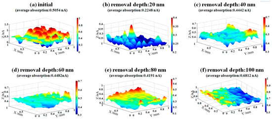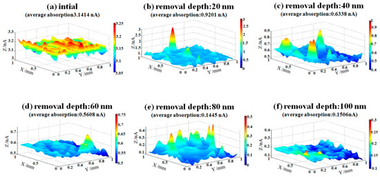 The initial weak absorption signal of sample 1# is 0.5054 nA (Figure 12a). After removing 20 nm depth, the signal drops to 0.2248 nA. When removal depth continues to increase to 80 nm in EJP processing, the signal rises to 0.4191 nA and maintains at a certain level (Figure 12c–e). When the removal depth comes to 100 nm, the signal rises to 0.6812 nA. It can be seen that weak absorption signal of sample #1 fluctuates during EJP processing, which relates to the surface conditions.
