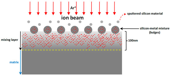 In this model, metallic elements are considered to distribute evenly beneath the surface, called the mixing layer, which is similar to the perturbative layer. Based on Section 3, the depth of mixing layer is ~100 nm, which is influenced by IBE parameters. Attributed to the long-term effect of high-energy ion beam, metallic elements mix with silicon and change the properties of materials in local areas. Because of its different atomic number aluminum sputters less than silicon in IBE processing, which promotes the generation of silicon–metal mixture on the surface. It can be seen that materials removal is faced with uncertainties due to the existence of mixing layer. Experiments in Section 3 show the influence of mixing layer and verify this model (Figure 14).