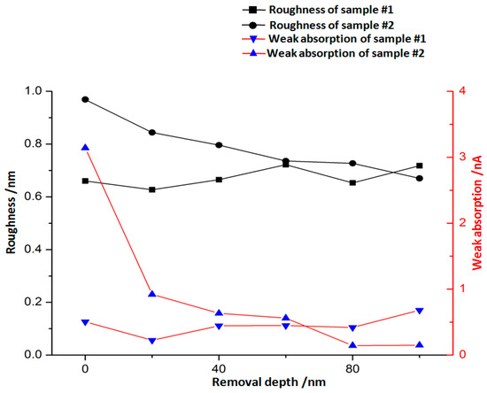For weak absorption, it relates to many factors. In this work, the metallic contaminant needs to be considered. It can be seen that the initial surface of sample #1 and sample #2 after removing materials to 100 nm have similar roughness values (Figure 8a and Figure 11f), but the weak absorption signal of sample #1 is three times stronger than sample #2. It also can be seen that the roughness of sample #1 (Figure 8d) is almost the same as that of sample #2 (Figure 11e), while weak absorption of sample #1 is still higher than sample #2. For sample #2, the metallic contaminant represented by aluminum is removed almost completely after SAE processing. From the above, it is proven that the difference of weak absorption can be attributed to the existence of metallic contaminant. In Figure 15, it should be noticed that the trend of roughness is consistent with that of weak absorption. However, there is no linear relationship between them. Researches have already proved that weak absorption is driven by medium-and-high frequency errors [27,28,29]. In other words, weak absorption signal is proportional to roughness value. and the effect of roughness should be considered as well.