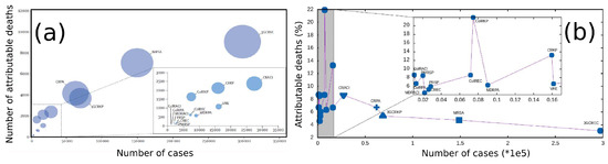 The number of MDR bacterial strains has increased significantly and, although many financial resources have been invested, MDR has become faster than the development of new classes of antibiotic molecules. This problem has not only clinical but also economic implications, as reported in a recent study [2] where authors estimate the health burden caused in EU and European Economic Area (EEA) in 2015 by antibiotic-resistant bacteria. The study measured the impact of the phenomenon in terms of number of cases, number of attributable deaths and disability-adjusted life years (DALYs), calculated as the sum of “Years of Life Lost” and “Years of Life lived with Disability”. Eight bacterial species frequently isolated from blood or cerebrospinal fluid have been included in this study: Acinetobacter spp.; Enterococcus faecalis and faecium; Escherichia coli; Klebsiella pneumoniae; Pseudomonas aeruginosa; Staphylococcus aureus meticillin-resistant (MRSA) and Streptococcus pneumoniae. Results showed that 67.9% of DALYs were caused by infections with E. coli and K. pneumoniae (resistant to cephalosporins of third-generation), S. aureus (methicillin-resistant) and P. aeruginosa (carbapenem-resistant); bacteria resistant to carbapenems or colistin are responsible for 38.7% of DALYs. Authors showed also that every age is involved in infections, significantly in childhood. In adults, the burden increases with age, suggesting that the overall ageing of population in EU and EEA entails a worsening of the problem. Figure 1a shows the number of attributable deaths, in 2015, as a function of the number of cases in EU and European Economic Area for each bacterial species under analysis. Diameter of bubbles represents DALYs. From data reported in Table 1 of that study [2], we inferred Figure 1b, which shows the association between the number of cases in EU and European Economic Area in 2015 and the percentage of deaths for each antibiotic-resistant bacteria. Figure 1a,b show that the effect on health of antibiotic-resistant bacteria is related not only to virulent infections with large incidences, and therefore large DALYs values, (bubbles diameters in Figure 1a), but also to low incidence infections like carbapenem-resistant K. pneumoniae, a case where the percentage of attributable mortality may result very high (see Figure 1b).