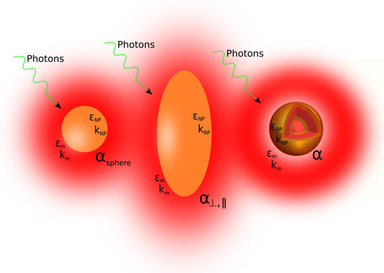 Under the action of an impinging, resonant, electric field, due to the LPR onset, a single MNP produces heat by Joule effect (see Figure 2); thus, in order to describe its temperature variation, it is necessary to known its electric response function, that is its polarizability . This appears in the relation between the dipole moment induced in the MNP and the electric field of the impinging electromagnetic wave: