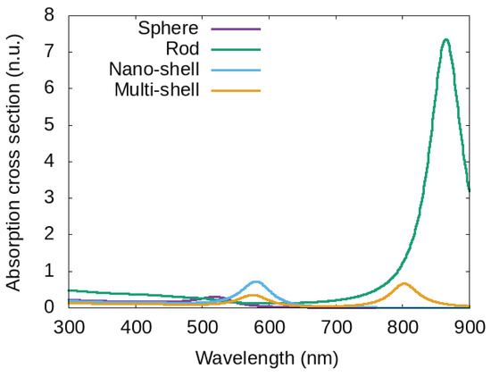 In order to provide a possibility of comparison, we report in Figure 3 the absorption cross section of four MNPs surrounded by water, with the same total volume, but different shapes and/or structures: a gold nano sphere with radius nm, a gold nanorod with the same total volume (16 nm and ∼7.9 nm for long and short axis respectively), a nano-shell made of a silica-core (with radius 7 nm and a gold shell of 3 nm), and a multi-shell structure (onion-like) with total radius 10 nm obtained by starting from a dielectric core and alternating gold/dielectric shells.