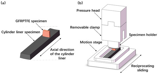 The wear tests were performed on an in-house-designed contraposition-reciprocating tribology device as illustrated in Figure 1b. The test arrangement is nominally identical to those of the reciprocating tribo-tester detailed in the previous reports [13,14,15]. The GFRPTFE specimen placed between the cylinder liner specimen and the pressure head was mounted on the holder, which was connected with a horizontally-fixed force sensor. During the sliding, the GFRPTFE specimen and the pressure head were kept still, whilst the heated stage moved to and fro. The applied normal force was 28.8 N, resulting in the contact pressure of 1.6 MPa. The sliding speed and stroke length were 300 rpm and 50 mm. The variable experiment parameter is the temperature; the tests were conducted at 50 °C, 80 °C, 100 °C, 120 °C, 140 °C, 160 °C, 180 °C, and 200 °C without lubrication. After 15km sliding, the GFRPTFE specimens were taken out and cleaned for the measurement of weight loss, and the wear rate was calculated by dividing the weight loss by the sliding distance. Four repeat tests were carried out for each temperature.