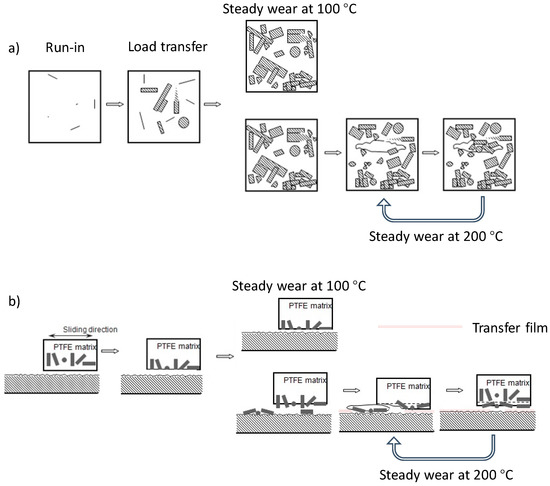 The initial run-in period, where the wear rate is comparatively high, is characterized by the micro-plowing and micro-cutting of the PTFE on the surface of the ring specimen. At the beginning of the sliding, the glass fibers are almost fully buried beneath the top PTFE layer, so only the PTFE is in direct contact with the steel counter-face (see Figure 11, run-in period). As a result, the asperities on the counter-face can easily cut the PTFE, causing the relatively high wear rate. In addition, the nature of viscoelasticity induces the higher viscosity, but lowers the young’s modulus and the yield strength as well as the shear strength of PTFE under higher temperatures, so the friction coefficient and the wear rate are increased with the temperature (see Figure 3 and Figure 4).