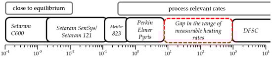 Scanning rate range of different conventional differential scanning calorimetry (DSC) devices and non-conventional fast scanning calorimeters.