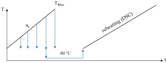 SARMAST et al. [] show some characteristic simulated time-temperature curves in the heat-affected zone during arc welding of thick aluminum sheets. These non-linear temperature profiles were imitated again in the quenching dilatometer, interrupted at selected points by an overcritical quenching, and then frozen at −80 °C. Subsequently, the samples obtained were reheated in the DSC.