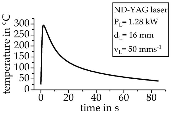 Figure 3 shows the time temperature profile recorded during a laser short-term heat treatment of an aluminium extrusion profile (EN AW-6060) with a wall thickness of 2 mm. The laser heat treatment, as well as the recording of the time-temperature-profile, was carried out at the Institute of Manufacturing Technology of the University of Erlangen-Nürnberg []. The laser heat treatment is characterized by a high heating rate up to several 100 Ks−1, with no soaking at the maximum temperature and a relatively slow, non-linear, cooling with a few 10 Ks−1.