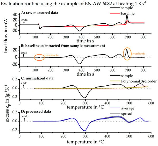 The raw data treatment is illustrated in Figure 4. The basis is the high-quality raw DSC data, as shown in Figure 4A. The baseline is subtracted from the raw heat flow data of the sample measurement, eliminating the device specific curvature, as seen in Figure 4B. When switching between isothermal soaking to heating and again to isothermal soaking at high temperatures, overshoot artefacts appear in the curves. These overshoot artefacts must be removed from the measurement data to avoid misinterpretations. In the next step, the data is normalised, according to Equation (1), to the unit of specific excess heat capacity. Despite due diligence when conducting the measurements, there may be small deviations between the individual measurements. This is, for example, caused by slight variations of the sample or furnace lid positions. These deviations cannot be avoided and lead to a further slight curvature of the measured data, particularly its zero level []. By fitting and subtracting a 3rd order polynomial, the measured data can be corrected for this zero level curvature, as shown in Figure 4C []. Figure 4D shows the average curve from the four processed single measurements and the scattering of the measurements. The data scattering is illustrated by plotting the DSC curves with minimum, as well as maximum, values and shading the area in-between. In the further results, only the mean value curves are shown, because the deviations between the individual measurements are small.
