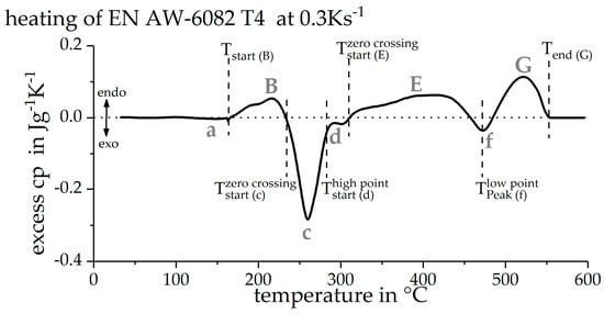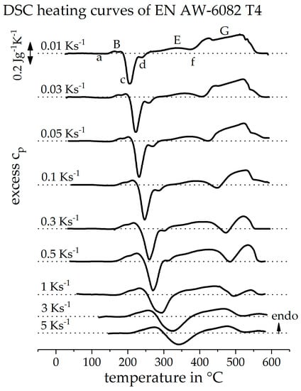 In the initial naturally aged state, there might be solved alloying elements in solid solution. With a slight increase in temperature, these can form clusters. The weak exothermic peak (a) is therefore generally interpreted as the precipitation of clusters resulting from the residual potential of solved alloying elements []. This is followed by the endothermic peak (B), which probably consists of two separate reactions. It represents the dissolution of clusters and Guinier Preston (GP)-zones that have formed during previous natural aging []. The dissolution reactions underlying this peak have an enormous influence on the mechanical properties. In this temperature range, the strength-increasing nano-particles of natural ageing are dissolved, causing a significant softening of the material []. At higher temperatures, the exothermic peaks (c) and (d) appear. These two peaks are commonly interpreted as the precipitation of the metastable phases β” and β’ []. Precipitates of the β” phase can provide the highest strength, while the precipitation of the phase β’ corresponds to the overaged state. The endothermic peak (E) is considered to be the dissolution of the previously formed metastable phases β” and β’ []. Following, the exothermic peak (f) represents the precipitation of the equilibrium phase β-Mg2Si []. At high temperatures, the endothermic peak (G) appears. This is considered to be the dissolution of the equilibrium phase β-Mg2Si and other remained phases []. With the finish of the peak (G), the DSC signal drops to zero, which indicates the scanning rate specific solvus temperature. Thus, the evaluated finish temperature of peak (G) at least has a physical meaning.