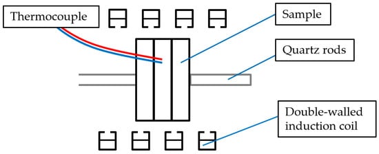 In order to realize very flexible initial heat treatments, a highly dynamic measuring setup is necessary. Conventional DSCs cannot meet these requirements. For this reason, the initial heat treatment, before reheating, is carried out in a Bähr 805A quenching dilatometer. In this device, the samples are placed in the centre of an induction coil. Defined heating rates of several 100 Ks−1 can be achieved. The sample temperature is continuously controlled via a spot-welded thermocouple on the surface of the sample. The samples are clamped between two quartz glass rods and held in position. The induction coil is double-walled. Gas can be passed through the inner perforated wall. Thus, cooling can take place via gas quenching and cooling rates of a few 100 Ks−1 can be achieved. The schematic heat treatment setup in the dilatometer is shown in Figure 6.