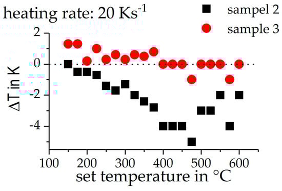 In order to evaluate the temperature distribution between the three individual samples, all three samples were provided with thermocouples in preliminary tests. Figure 7 shows the maximum deviation from the target temperature (ΔT), during a heating experiment, towards distinct maximum temperatures, using a heating rate of 20 Ks−1. It can be seen that the maximum temperature deviates from the target temperature by, at most, 5 K. However, most samples deviate by less than 2 K. This error is considered to be low.