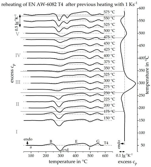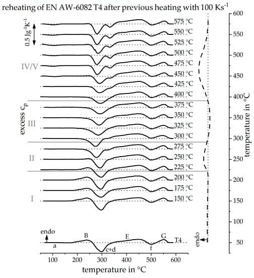 In section IV, up to 475 °C, the intensity of peak (c + d) increases, again with increasing maximum temperature during the initial heat treatment. This behavior can be explained by the dissolution of the phases β” and β’. When these are dissolved during the initial heat treatment, the concentration of the aluminum solid solution, before the reheating step, increases. Thus, during reheating, the precipitates of peak (c + d) may form again. The more phases are dissolved during the initial heat treatment, the more alloying elements are solved, and the more precipitates can form during reheating. Therefore, it can be concluded, from the reheating curves, that mainly the phases β” and β’ dissolve in section IV during the initial heat treatment. This is indicated by the directly measured reheating curve.