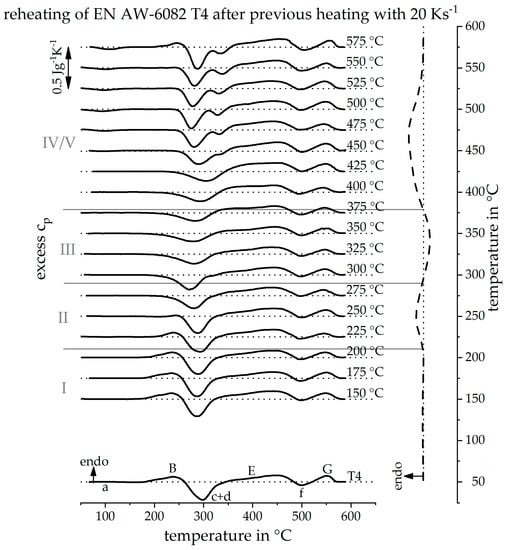 This series of measurements has shown the feasibility of the proposed indirect DSC method. From reheating, the temperature ranges can be identified at which precipitation and dissolution reactions take place during the initial heat treatment. Therefore, by applying this procedure, unknown or unavailable DSC heating curves can be reconstructed qualitatively.