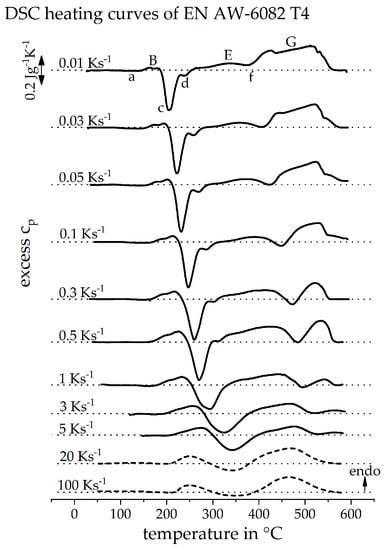 The final dissolution reaction (G) also appears to lose intensity with an increasing heating rate. During this dissolution reaction, it is mainly the precipitates that have been formed during previous heating which are dissolved. This peak should become weaker if the previous precipitation reactions are suppressed with an increasing heating rate. During slow heating, coarse precipitates are formed, which must be dissolved afterwards. Increasing the heating rate should result in finer precipitates, which dissolve faster. For this reason, final dissolution of precipitates seems to be completed even at higher heating rates.
