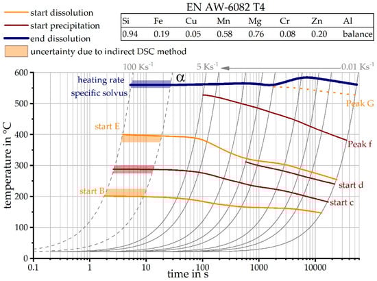Figure 13 shows the continuous heating dissolution diagram of the investigated alloy 6082 T4 obtained from the results given in Figure 12. This diagram is suitable for the selection of reasonable heat treatment parameters during production, as well as a necessary input for heat treatment simulations. The continuous heating dissolution diagrams are valid only for continuous heating steps and, therefore, are to be read at a selected heating rate (grey line) from low to high temperatures only. During heating, different reaction areas are run through. Finally, the heating rate specific solvus temperature is reached. Above this temperature for the specific heating rate, it is considered that all major alloying elements are in solid solution. Due to the proposed indirect DSC method, the heating rate range could be enlarged significantly towards higher rates.