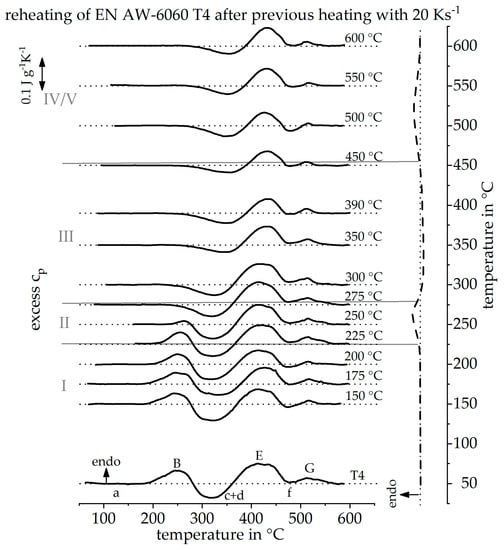 Sections IV and V are considered together. In the reheating curves after a maximum temperature above 375 °C during the initial heat treatment, peak (c + d), on the one hand, regains its intensity with increasing maximum temperature and, on the other hand, splits into two individual peaks (c) and (d). Furthermore, a weak precipitation reaction, peak (a), occurs during reheating at low temperatures. Peak (G) also loses some of its intensity in the reheating curves after the high maximum temperatures of the initial heat treatment. From these observations, it can be concluded that during the initial heat treatment, a dissolution of phases β” and β’ as well as phases with a higher solvus temperature has taken place. An area in which the precipitation of equilibrium phase β-Mg2Si dominates could not be identified. Probably, this precipitation reaction is greatly suppressed at heating with 20 Ks−1. Thus, from the findings, a broad dissolution reaction in the reconstructed heating curve was assumed.