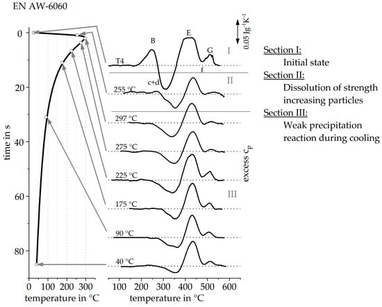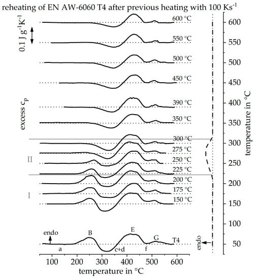 Figure 15 shows the heating DSC curve reconstruction for a heating rate of 100 Ks−1. It is noticeable that, above a maximum temperature of 300 °C, the reheating curves show little change. From these results it can be concluded that the precipitation state no longer changes above 300 °C during this very rapid heating. It can be seen, from section II, that the T4 strength increasing precipitates are dissolved between 225 °C and 300 °C. However, the heating rate of 100 Ks−1 is obviously high enough to suppress further precipitation reactions. Figure 16 shows the continuous heating dissolution diagram of EN AW-6060 T4, including the findings of the indirect measurements. The heating curves of direct DSC measurements have already been published and can be seen from Fröck et al. []. It also becomes clear, that with this alloy, the results of the indirect measurements fit very well into the results of the direct DSC. The results have shown that the described method is also suitable for extending the bandwidth of scanning rates of other alloys.