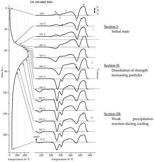 Figure 18 shows the investigated time temperature profile for the HAZ of an arc welding process on the left side [], the recorded reheating curves of the alloy EN AW-6082 T6 in the middle, and the concluded precipitation and dissolution reactions on the right side. It is clearly visible that the reheating curves of the initial artificial aging T651 have a different course than those of the initial natural aging T4. From the reheating curves seen in Figure 18 Section I, up to a temperature of 250 °C, no obvious change is seen. From this it can be concluded that the precipitation state does not change up to this temperature. Section II, between 250 °C and 490 °C, shows that peak (B) disappears and peak (d) occurs more pronounced with increasing temperature. It can be concluded that during the HAZ heat treatment the T6 precipitates are increasingly dissolved. The dissolution of precipitates results in solved alloying elements which can form precipitates during reheating, which explains the increase of the peak (d). In Section III, the cooling, only weak reactions take place. It becomes clear that the two reactions (d) are steadily weakening. It can be concluded that a slight precipitation reaction occurs during cooling. This nicely correlates with findings on the upper critical cooling rate for this batch of EN AW-6082 of about 30 Ks−1 []. Considering the non-linear cooling within the simulated HAZ, an average cooling rate of about 12 Ks−1 is achieved in the relevant temperature range of 490–200 °C. As this cooling rate is below the upper critical cooling rate, a certain volume fraction of quench induced precipitation is to be expected.