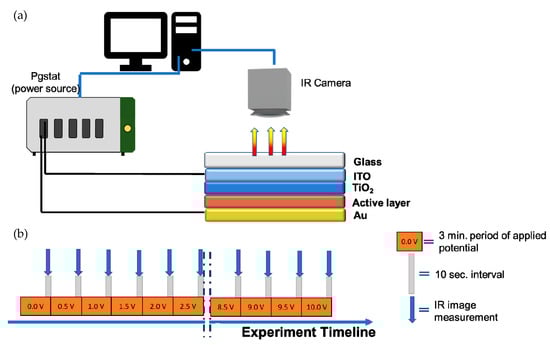 Thermography setup used to record images at different potentials (a); experimental timeline visualization presenting steps during thermographic experiment (b).