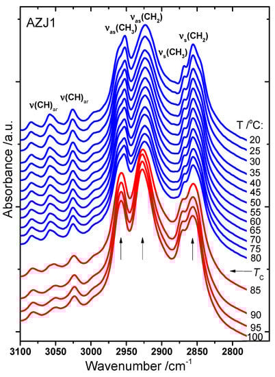 Temperature-dependent FT-IR spectroscopy was applied in order to obtain more information about the nature of the phase transition between the crystalline and liquid crystalline (LC) phases. The spectra obtained in the ordered phase and LC phase are marked with a blue and red colour, respectively (Figure 2 and Figure 3). Additionally, the horizontal and vertical arrows point to the phase transition region and the IR bands which changed the most during the transition. As the highest possible temperature in this experiment is 130 °C, we could not study the other transitions observed at much higher temperatures. Figure 3 presents temperature evolution of the IR spectrum of AZJ1 registered during heating in the high-wavenumber region (>2750 cm−1), where the ν(CH) stretching vibrations of aliphatic chains as well as aromatic rings occur. The bands connected to νas(CH2) and νs(CH2) vibrations of aliphatic chains usually appear at 2915 and 2850 cm−1, respectively, which corresponds to highly-ordered hydrocarbon chains with an all-trans conformation. In the case of AZJ1, asymmetric CH2 vibration appears at 2924 cm−1 at room temperature, thus at a relatively higher energy, indicating the existence of trans and cis isomers in the hydrocarbon chains. On conversion from the ordered to LC phase, some changes in this region of the IR spectrum are also clearly visible: the position of the band mentioned earlier shifts toward higher wavenumbers by about 3 cm−1. The bands connected to νas(CH3) and νs(CH2) modes, which are split into two components at room temperature, become single at the LC phase.
