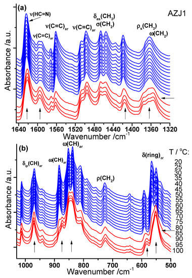 Temperature evolution of the FT-IR spectrum of AZJ1 obtained during heating in two spectral ranges: (a) 1645–1320 cm−1 and (b) 1030–500 cm−1. Ordered and liquid crystal phases are marked blue and red, respectively. The most changed bands upon the transition are marked with vertical arrows.