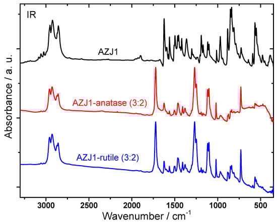 Comparison of room-temperature FT-IR spectra of pure AZJ1, AZJ1–TiO2 (anatase) and AZJ1–TiO2 (rutile) mixtures marked with different colors.