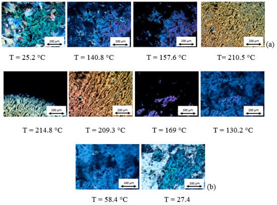 Photomicrographs of the optical textures registered at various temperatures for the AZJ1 during heating (a) and cooling (b) at a rate of 10 °C/min.