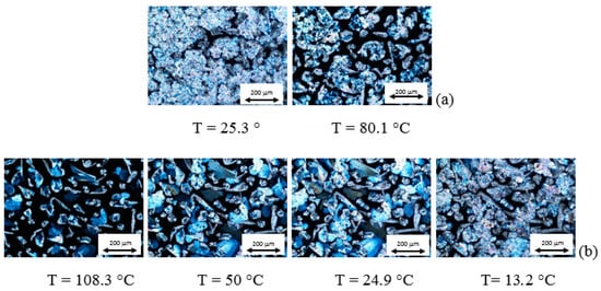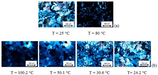 Photomicrographs of the optical textures registered at various temperatures for the AZJ1:TiO2 (rutile) during heating (a) and cooling (b) at 10 °C/min.