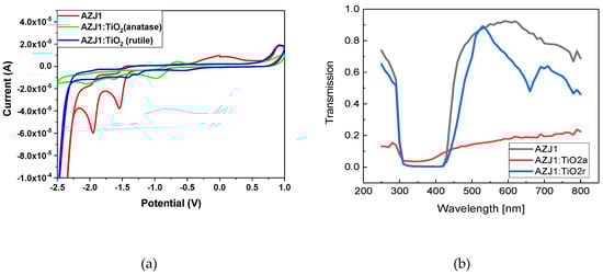(a) Cyclic voltammograms (CV) of the mixture of AZJ1 with two different TiO2 crystallographic structures—rutile and anatase—in solution. CV sweep rate ν = 100 mV s−1, 0.2 M Bu4NPF6 in acetonitrile. (b) UV-Vis transmission spectra (transmission spectra of TiO2 suspensions in chloroform are presented in Figure S7).