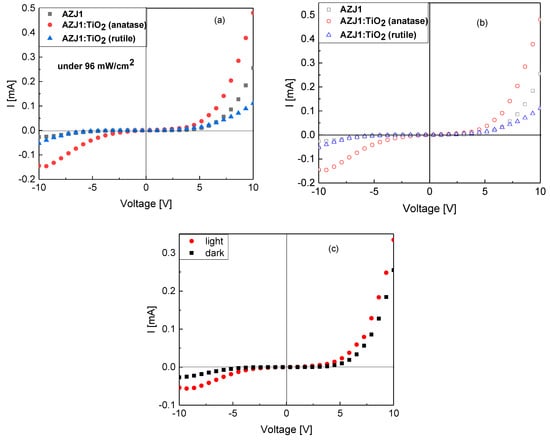 The I–V characteristic for devices with an architecture of ITO/TiO2/organic layer/Au was measured in the dark and under solar illumination. For azomethine and its mixtures with TiO2 (anatase and rutile), the generation of photocurrent does not occur, as there is no difference between the dark and light I–V characteristic. Figure 9 shows the comparison between these three devices under illumination and in the dark together with I–V characteristics for ITO/TiO2/AZJ1/Au in the dark and under illumination, as an example. The highest intensity of current was observed for AZJ1:TiO2 (anatase) and the lowest was AZJ1:TiO2 (rutile).