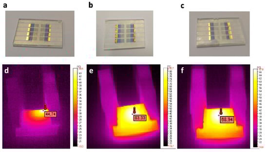 Images of the prepared devices: glass/ITO/TiO2/AZJ1/Au (a); glass/ITO/TiO2/AZJ1:TiO2(rutile)/Au (b); glass/ITO/TiO2/AZJ1:TiO2(anatase)/Au (c) and IR images of those devices respectively containing only AZJ1 (d), and mixture of AZJ1 with TiO2 in the form of rutile (e) and anatase (f) at an applied potential of 8.5 V.