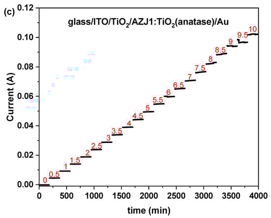 The correlation of time-dependent current flow at different applied potentials can be seen in Figure 11. Based on the observed tendency, all samples showed conductive behavior as expected, with differences in obtained values of resistance. In principle, resistance decreases linearly with increasingly applied voltage, which is also related to increments of temperature, as expected for conducting layers. Resistance ranged from 727.2 Ω, 183.6 Ω and 112.9 Ω to 504.0 Ω, 134.4 Ω and 97.8 Ω respectively for samples containing AZJ1, AZJ1:TiO2(rutile) and AZJ1:TiO2(anatase). Those findings are consistent with the results of electrical properties obtained for devices during illumination, where it was observed that the lowest resistance was for glass/ITO/TiO2/AZJ1:TiO2(anatase)/Au and the highest was for glass/ITO/TiO2/AZJ1/Au. Only in the case of devices with the architecture of glass/ITO/TiO2/AZJ1:TiO2(rutile)/Au, a small decline in current was observed when 10 V was applied on bias. This can be related to only one melting transition observed in DSC for the mixture AZJ1:TiO2(rutile) at 68.85 °C, since 10 V applied on a sample caused an increase of temperature to 70.4 °C, which is in the range of above-mentioned transition. For other samples this phenomenon was not observed, because pure AZJ1 and its mixture with the anatase form of titanium dioxide has other transitions at higher temperatures, which explains the higher thermal resistance of layers.
