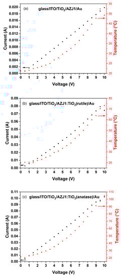 The correlation of current flow and temperature versus applied potential for constructed devices containing only AZJ1 (a), and mixture of AZJ1 with TiO2 in the form of rutile (b) and anatase (c).