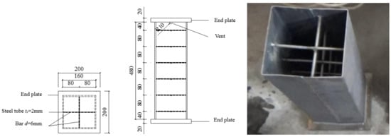 The design of test specimens is shown in Figure 1. The steel sheet with the thickness of 2 mm was cut and bent into a U-shaped plate. Then, two U-shaped plates were spliced and welded together by the butt weld. The steel stiffeners are composed of HPB300 hot-rolled round steel bars, and the steel bars were welded to the inner wall of the steel tube. A semi-circular venting hole with a diameter of 20 mm was designed at the upper end of the steel tube to facilitate evaporation and discharge of moisture inside the concrete of the specimen under high temperature. Two steel plates with the dimensions of 200 mm × 200 mm × 20 mm were designed as the cover plates of the test specimen, one of which was selected to be welded to one end of the test specimen as the bottom plate. After pouring the concrete, the other cover plate was taken to be welded to the other end of the test specimen as the roof plate.