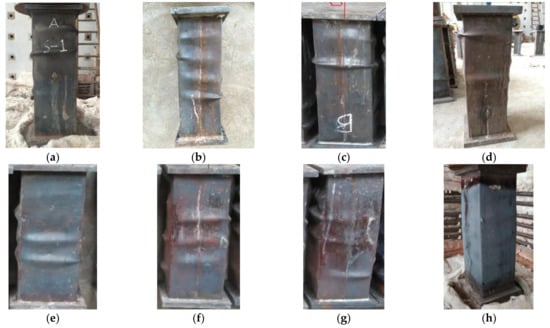 - Sun, L.; Jia, M.-M.; Zhang, S.-M.; Lu, D.-G. Experimental research of seismic performance of concrete filled steel tube composite frame structure with welded buckling-restrained braces. J. Harbin Insi. Tech. 2011, 43, 190–195. [Google Scholar]
