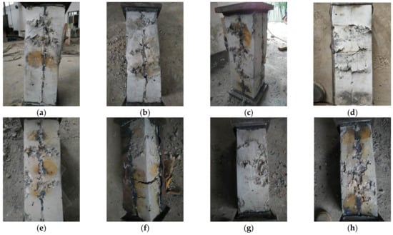 Figure 4 shows the photos of the final appearances of specimens after the experimental tests. It can be seen that the steel tubes exhibit buckling (directional deviation from concrete) after the tests of high-temperature 20–200 °C. The locations of the buckling at different sides of the specimen are not the same. The buckling mainly occurs in the middle or at the ends of the specimen, which is asymmetrically distributed on the opposite sides. The curvatures of buckling were found to be similar after measurements. Among them, the curvature degree of steel tube buckling of the non-stiffened specimen (DS-200-0) was high. The rupture phenomenon happens due to the buckling at the top area of the steel tube, leading to slight bending of the whole specimen. It is of note that its integrity is not as good as that of rebar stiffened specimens. The buckling is mainly in the middle area of the steel tube for the specimens exposed to high temperature of 400–600 °C. The steel tube buckling of the case of 800 °C high temperature mainly occurred in the adjacent position of the central steel tube. Due to the fact that the outer surface of the steel tube is covered by an oxide layer, the buckling curvature was not as sharp as that of the specimen under low temperature.