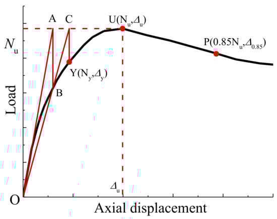 Table 5 summarizes the testing results of compressive stiffness (EA), yield load (Ny), yield displacement (△y), peak load (i.e. residual bearing capacity Nu after fire exposure), peak displacement (△u), and 0.85 Nu after peak load (△0.85) and ductility coefficient (μ△ with the expression in Equation (1)). The geometric drawing method was employed to find the yield load and the yield displacement of the load–displacement curve by making a characteristic line, as shown in Figure 7. First, the peak tangent U was used as the horizontal tangent of the curve, intersecting the origin tangent (EA) at point A, passing the point A as the vertical axis of the displacement axis, intersecting the curve at point B, connecting the line OB to the line AU at point C, and passing the point C. The vertical line of the displacement axis intersects the point Y, which is the yield point. Hence, the horizontal and vertical coordinates Δy and Ny corresponding to the Y point are the yield displacement and the yield load, respectively.