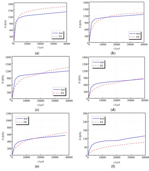 To further validate the capacity of the developed finite element (FE) model, a comparative study was conducted by comparing the experimental results in [30] with the corresponding numerical results from the FE model in this study. The mechanical performances of six circular steel tubular short column specimens at 20 °C, 200 °C, 300 °C, 500 °C, 600 °C and 900 °C temperatures in ref. [30] were calculated using the developed model. Table 6 provides information on the parameters of six specimens in ref. [30]. Then, the simulation results were compared to the experimental results, which are shown in Figure 10. It can be seen from the figure that the simulation results match the testing results very well, which indicates the effectiveness of the FE model.