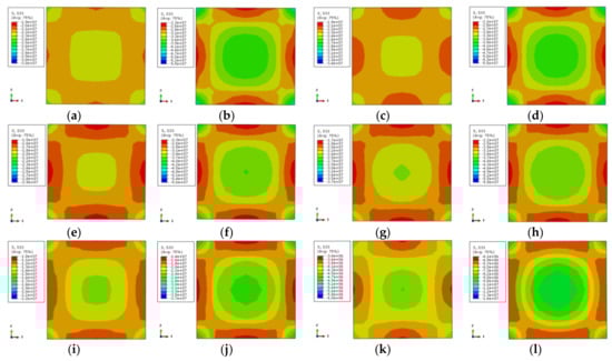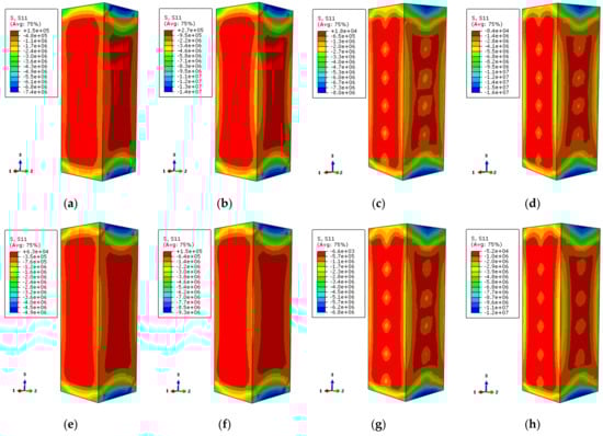 The transverse stress distribution of the concrete (one-direction) at elevated temperature is illustrated in Figure 12. The transverse stress distribution of the two characteristic points in the load–displacement curve is symmetric. The external corner is the high-stress zone followed by the core area, while the middle region of the column is the low-stress area. When the characteristic point achieves 0.75 times the ultimate bearing capacity, there is a large area of low-stress at ambient temperature and elevated temperature of 100 °C, except for the small area of the corner. With the increase of temperature, the core region and the corner become the high-stress zone while other areas are low-stress areas. When the characteristic point achieves the ultimate bearing capacity, the high-stress zone (X-shape) occurs in the adjacent diagonal area and the core region for the specimens occurs at 100 °C temperature and ambient temperature. The stress in the diagonal and core regions declines with the increase of temperature. The stress gradient of specimens under 800 °C temperature increases obviously, however, the distribution is basically the same.