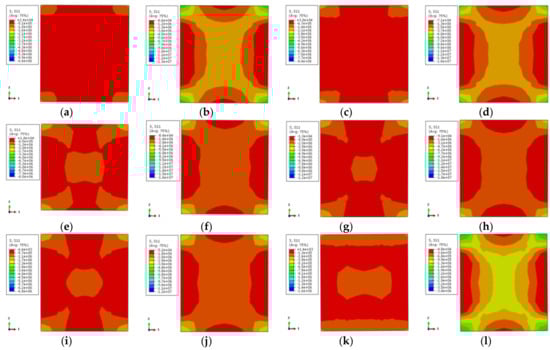 Stress distribution of concrete in the middle cross section of columns (a) DS-20-0.75; (b) DS-20-1; (c) DS-100-0.75; (d) DS-100-1; (e) DS-200-0.75; (f) DS-200-1; (g) DS-400-0.75; (h) DS-400-1; (i) DS-600-0.75; (j) DS-600-1; (k) DS-800-0.75; (l) DS-800-1.