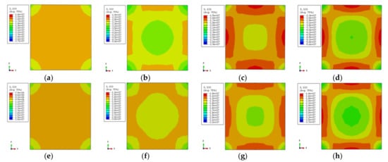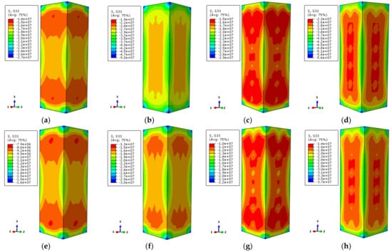 The vertical stress distribution of concrete (a) DS-200-0-0.75; (b) DS-200-0-1; (c) DS-200-0.75; (d) DS-200-1; (e) DS-600-0-0.75; (f) DS-600-0-1; (g) DS-600-0.75; (h) DS-600-1.
