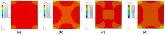 Figure 14 shows the transverse stress distribution (one-direction) of the concrete with the stiffener at 200 °C temperature. It corresponds to 0.75 times the ultimate bearing capacity in the rising-stage of the longitudinal load–displacement curve of the specimen. The transverse stress distribution of the stiffened rib corresponding to the characteristic point in the load–displacement curve of the case of 200 °C is symmetrical. The external corner of the specimen is high-stress zone while the middle area of the column is low-stress zone. When the characteristic point is 0.75 times the ultimate bearing capacity, the stress level in most areas is small, except for that in the corner. The overall stress contour of the section is in a petal shape after the reinforcement ribs are set for the stiffener enhances the stress. When the characteristic point achieves the ultimate bearing capacity, the stress distributions of the specimen cross-section are the same. The stress in the corner is enhanced, and the low-stress zone in the central area of the column is reduced.