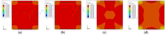 The Mises stress distribution of the steel tube (a) DS-200-0-0.75; (b) DS-200-0-1; (c) DS-200-0.75; (d) DS-200-1.