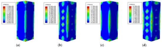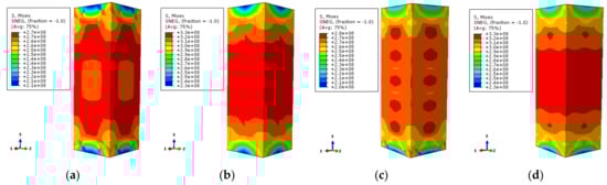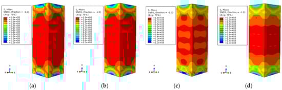 The contours of Mises stress distribution along the column height direction by finite element numerical calculation are shown in Figure 18 and Figure 19. The selected characteristic points correspond to 0.75 times of the ultimate bearing capacity and ultimate bearing capacity of the load–displacement relation curve of the specimen, respectively.
