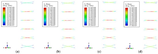 The Mises stress distribution of bar stiffeners (a) DS-200-0.75; (b) DS-200-1; (c) DS-600-0.75; (d) DS-600-1.