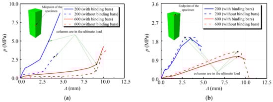 Figure 6b demonstrates the effect of the stiffening rib on the ultimate bearing capacity of the specimen under high temperature conditions. For the specimens with 200 °C temperature, the ultimate bearing capacities of the two types of specimen (stiffened and non-stiffened) are almost the same. It can be seen that the steel stiffened ribs have a minor effect on the ultimate bearing capacity. The load–displacement curve of the DS-200 (steel bar stiffened specimen), however, is relatively flat, showing good plasticity and ductility. For the specimens at 600 °C high-temperature, the ultimate bearing capacity of DS-600 is 73 kN higher than that of DS-600-0 (non-stiffened specimen). Setting stiffening ribs for the specimens under high temperature increases the ultimate bearing capacity of the specimen to a certain extent. In addition, the load–displacement curve of DS-600-0 is steep on both sides of the ultimate load, which indicates that the stiffening rib can still improve the plasticity and ductility of the specimen.