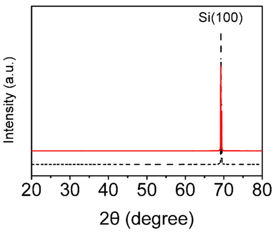 XRD patterns of a single-crystalline silicon plate (thickness 0.7 mm, resistivity 0.001 Ω∙cm). Raw single-crystalline silicon wafer (black dash line) and after thermal oxidation for 3 min (red solid line).